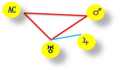 - Mercure Cancer, culminant au MC, valorise l’amas qui le relie à Pluton et au Soleil en Lion. Mercure sait mener sa barque personnelle d’autant plus qu’il est le point Apex d’un cerf volant qui le relie à Neptune/Saturne et la Lune : belle porte de sortie pour le complexe de castration indiqué par l’opposition Mars/Asc au double carré de la Lune (conjointe au FC) en Capricorne. Ce T-Carré est relié au MC et à Mercure culminant.