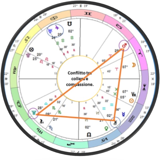 • Quadrato a T con Chirone in Quinta-Nettuno in Seconda-Marte in Ottava: la ferita spasmodica si nutre di collera e compassione, odio e perdono.