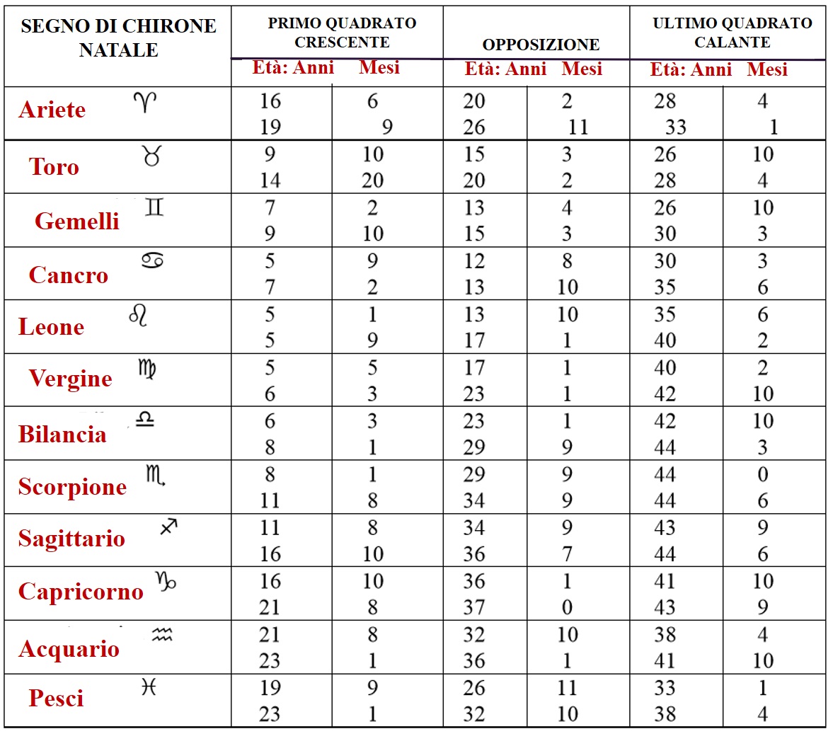 Ovviamente, anche Chirone ha un suo ciclo. Come per gli altri pianeti, i momenti salienti del ciclo sono 4: primo quadrato crescente, opposizione, quadrato calante e ritorno. Sempre a causa della sua strana orbita, le fasi non avvengono per tutti gli individui alla stessa età. Nella tabella che segue si trova l’età approssimativa in cui avvengono le fasi del ciclo, secondo il Segno natale di Chirone. Per una precisa individuazione della fase e della data effettiva, bisognerà tenere conto delle eventuali retrogradazioni che avvengono di anno in anno.