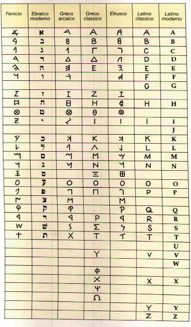 Nella seguente tabella si confrontano gli alfabeti delle principali lingue del mondo classico: