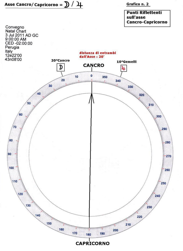 Brevemente passiamo ai punti a) e b) . Witte.aveva verificato che qualsiasi pubblico evento viene indicato dalla partecipazione dei pianeti che si riflettono sull’asse Cancro-Capricorno degli eventi mondani. ( grafico n. 2 – asse Cancro/Capricorno).