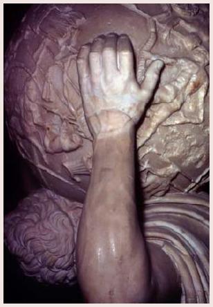 Osservandolo più attentamente, possiamo notare che le fasce muscolari delle braccia, dell’addome e del torace sono in forte contrazione. Lo stesso avviene per i solidi quadricipiti, volti a suggerire che tutta la sua forza è rivolta a sostenere l’enorme peso. A questo sforzo sono chiamate anche le arterie che, sotto la pelle, appaiono ben evidenti, partecipando così alla grande fatica del Titano.