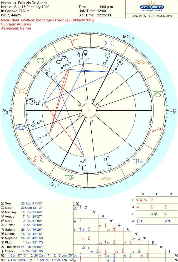 disse Fabrizio De Andrè (vedi Tema Natale) in un’intervista, un Acquario con Giove, Saturno, Marte e Urano in 11° Casa, aggiungendo, in un suo celebre brano: