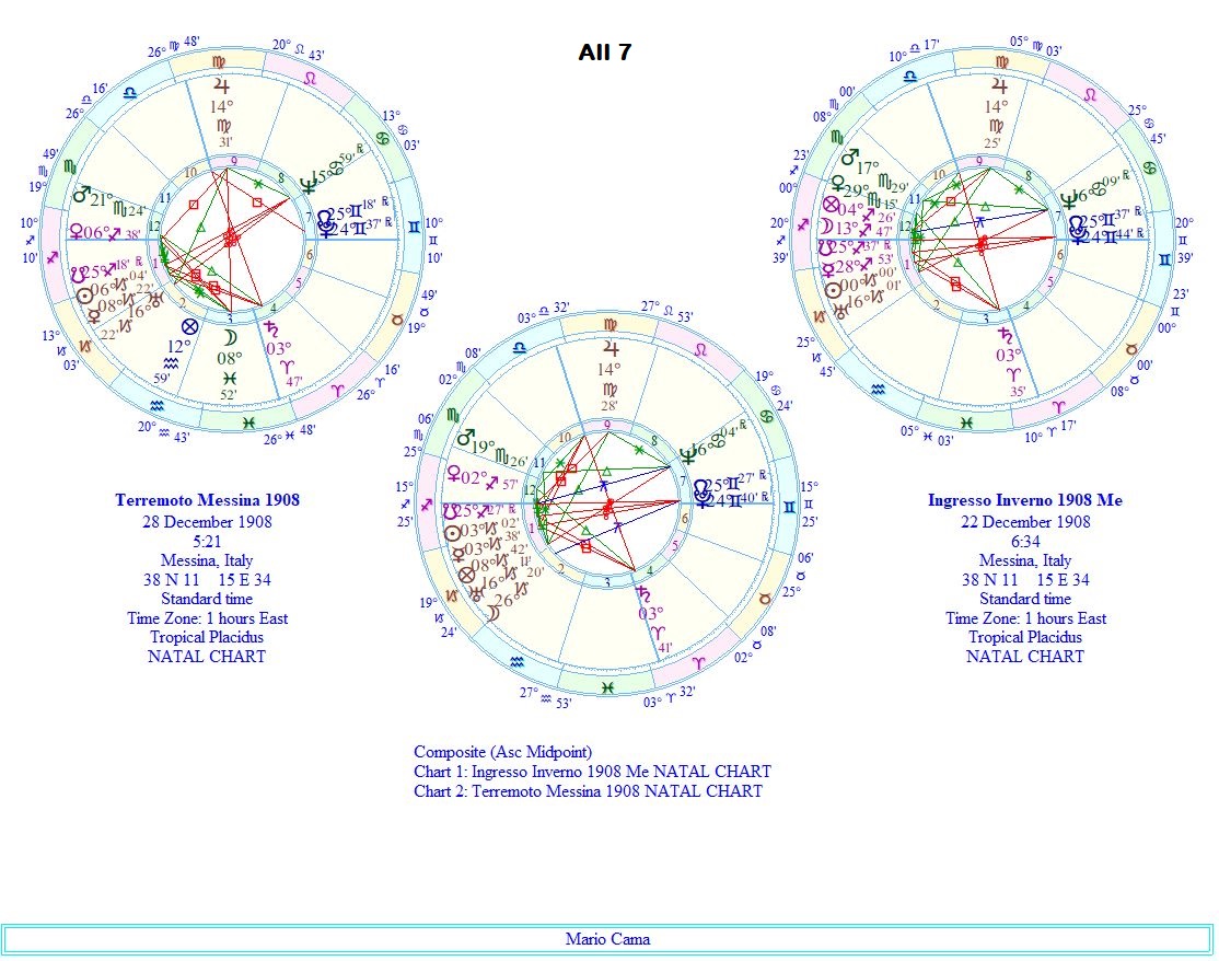 L’ingresso dell’inverno 1908 lasciava presagire qualche evento distruttivo. L’XI campo si trovava nel segno dello Scorpione e Plutone suo dominatore si trovava in VII. Marte transitava nell’XI campo ed era maestro del IV – terra-, la Luna maestra dell’VIII transitava in XII, il XII campo significatore dei Pesci e di Nettuno – acqua – lascia intendere anche l’azione del maremoto.